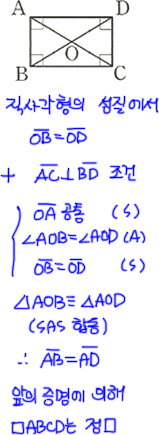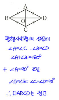 마름모의 정의를 정확히 말할 수 있는가? 마름모의 두 대각선이 서로 수직 이등분한다를 증명할 수 있는가? 평행사변형이 마름모가 되기 위해서 추가되어야 하는 조건은 무엇인지 아는가?